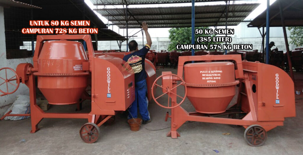 Beton Molen Premium Jumbo – solusi terbaik untuk kebutuhan konstruksi Anda. Dengan kapasitas 80 kg semen, Anda bisa mencampur hingga 728 kg beton dengan mudah. Dilengkapi dengan sistem penggerak worm gear dan plat 3mm serta bearing KOYO Jepang yang terkenal awet.